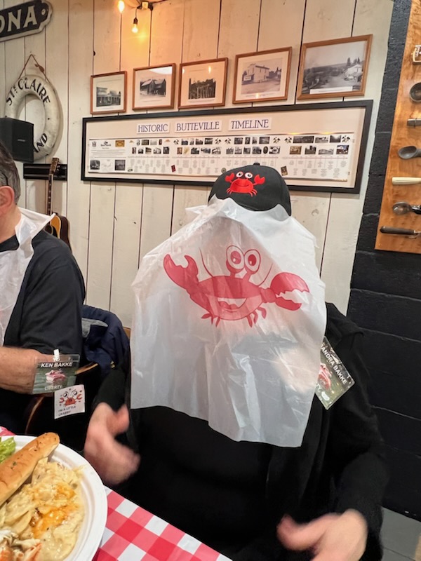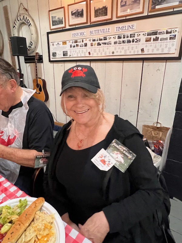 Sandy-Bakke-dressed-in-her-crab-hat.-Ken-Bakke-is-in-the-background-enjoying-the-delicious-crab